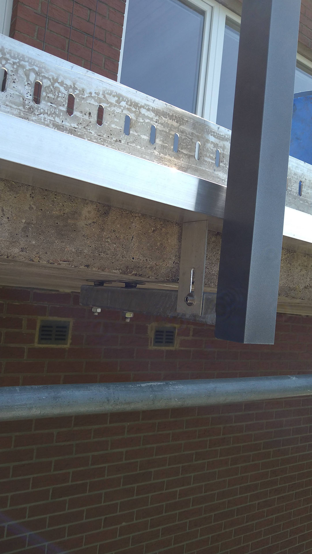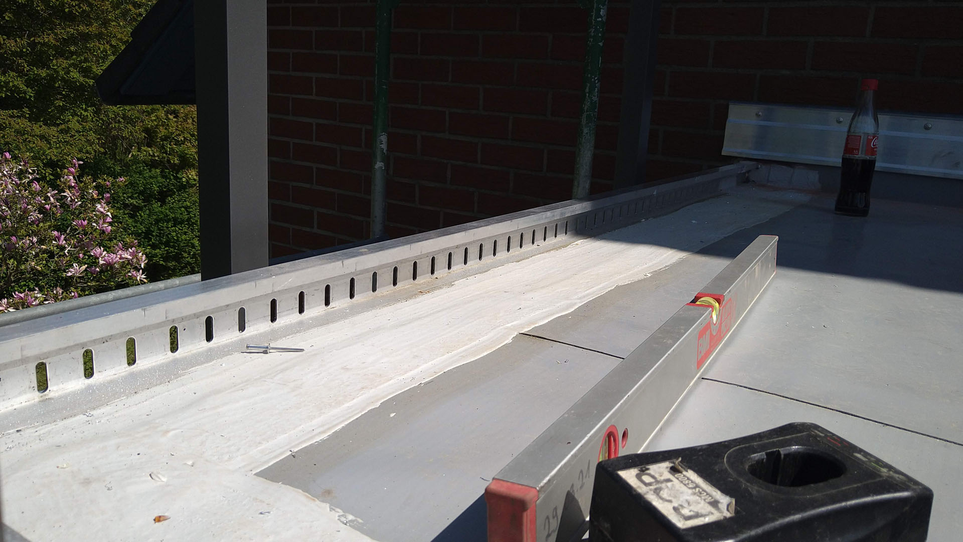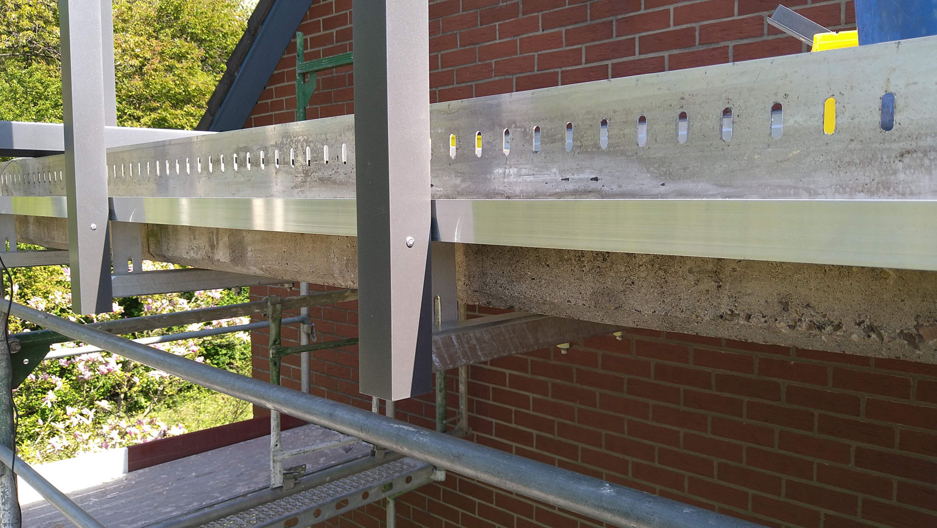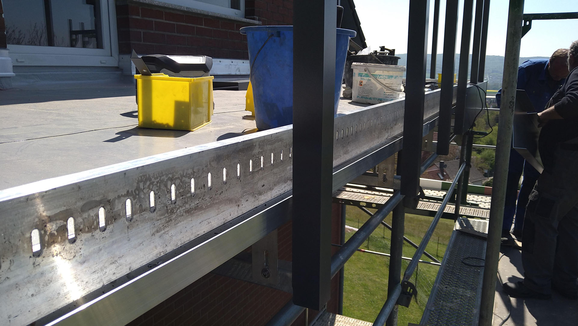 Die Montage der Alu-Regenrinne zusammen mit den Geländerhalterungen bietet den Vorteil, dass keine störenden Dachrinnenhalterungen oder Pfosten oben auf der Balkonplatte erforderlich sind, die in der Vergangenheit immer wieder zu Undichtigkeiten bei Balkonen führten und den Wasserablauf behinderten.